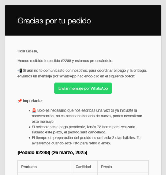 • Integración con WhatsApp: botón automático con mensaje dinámico (número de orden + productos), tanto en página de agradecimiento como en el email.